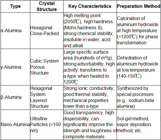 ການຈັດປະເພດຜົງຂອງ Alumina ແມ່ນອີງໃສ່ໂຄງສ້າງທີ່ມີໂຄງສ້າງແລະການກະກຽມຂອງມັນ. ປະເພດທົ່ວໄປແລະຄຸນລັກສະນະຂອງພວກມັນແມ່ນດັ່ງຕໍ່ໄປນີ້: